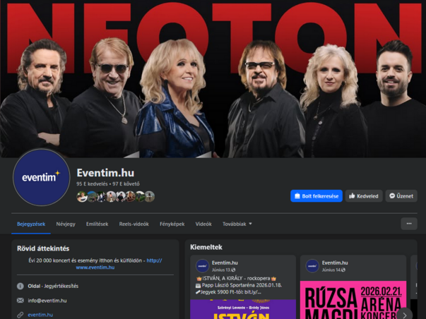 Az EVENTIM Facebook-oldala közel 100.000 követővel rendelkezik, ami kiemelkedő lehetőséget nyújt a széleskörű elérésre és a közönséggel való aktív kapcsolattartásra. Rendszeresen szervezünk játékokat és kvízeket a platformon, amelyek nemcsak magas interakciót generálnak, hanem jelentős organikus és fizetett elérést biztosítanak. Ezek az aktivitások tovább növelik a márka láthatóságát, erősítik a rajongói közösséget, és elősegítik az események iránti érdeklődés fokozását.