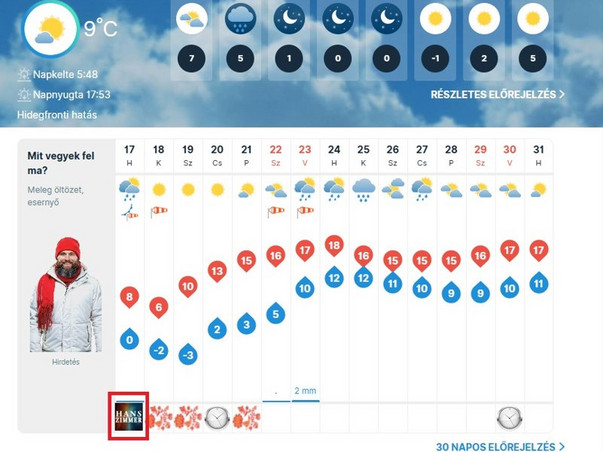 - 40x40 px fix, folyamatosan látható ikon megjelenés az idokep.hu nyitóoldali 12 és 30 napos előrejelző táblázatában.